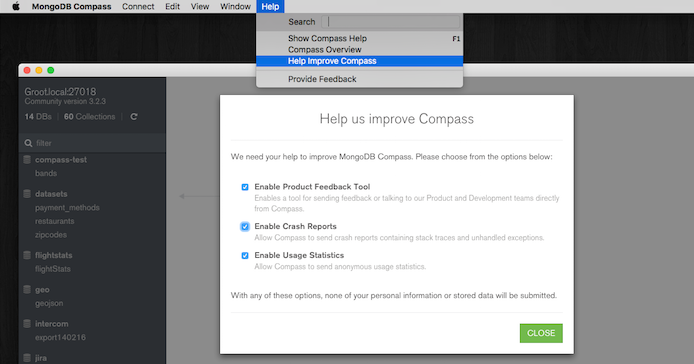 Please help us test this new version by opting in to usage stats and crash report collection. From the Schema Window, click "Help -> Help Improve Compass".